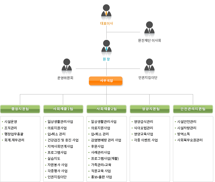 이사장실, 원장실, 사무실, 면회실, 회의실, 프로그램실, 관리실, 창고 |